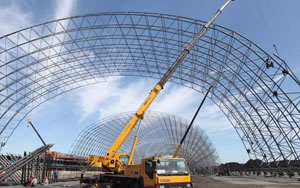 干煤棚網架主要搭建機構為平面剛架、平面桁架、平面拱以及柱面網殼結構。